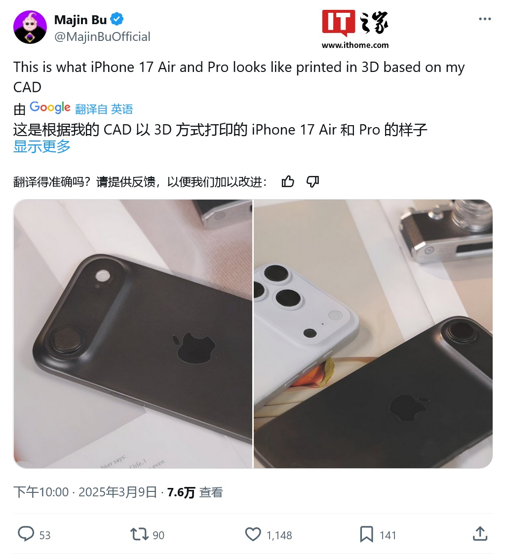 IT之家 3 月 10 日消息,消息源 @MajinBuOfficial 昨日在 X 平台发布推文,基于此前分享的 CAD 渲染图,展示了 3D 打印出来的 iPhone 17 Air 和 iPhone 17 Pro 两款手机机模。