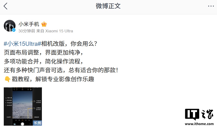 文章来源于互联网:IT之家-小米 15 Ultra 手机焕新极简相机亮点公布:页面布局调整、部分功能合并