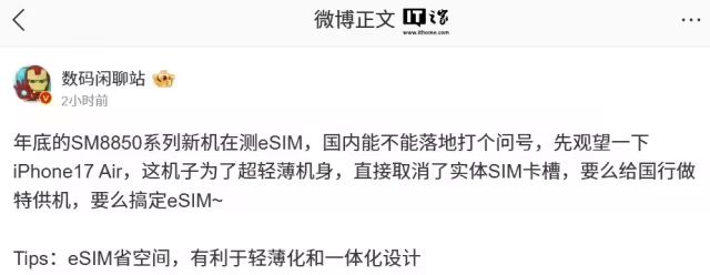 不知IT之家家友是否关注到这样一则消息,据微博博主今天(3 月 10 日)透露,iPhone 17 Air 为了轻薄机身直接取消实体 SIM 卡槽。