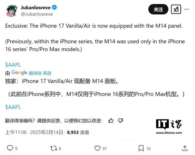 最后是屏幕素质:sammyguru 发文称,iPhone 17 全系都将配备三星提供的 M14 OLED 面板。