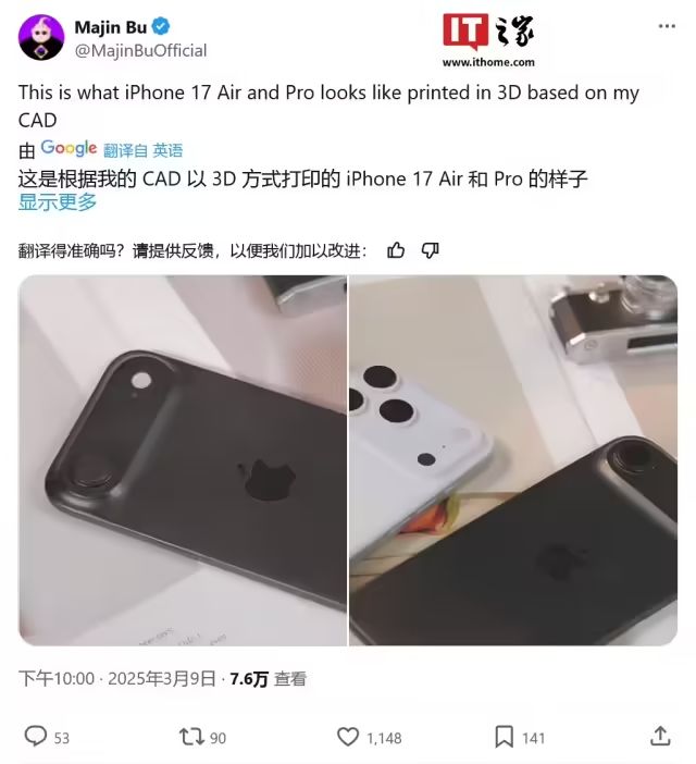 就在昨天(3 月 9 日),@Majin Bu 基于 CAD 渲染图,展示了 3D 打印出来的 iPhone 17 Air 和 iPhone 17 Pro 两款手机机模。