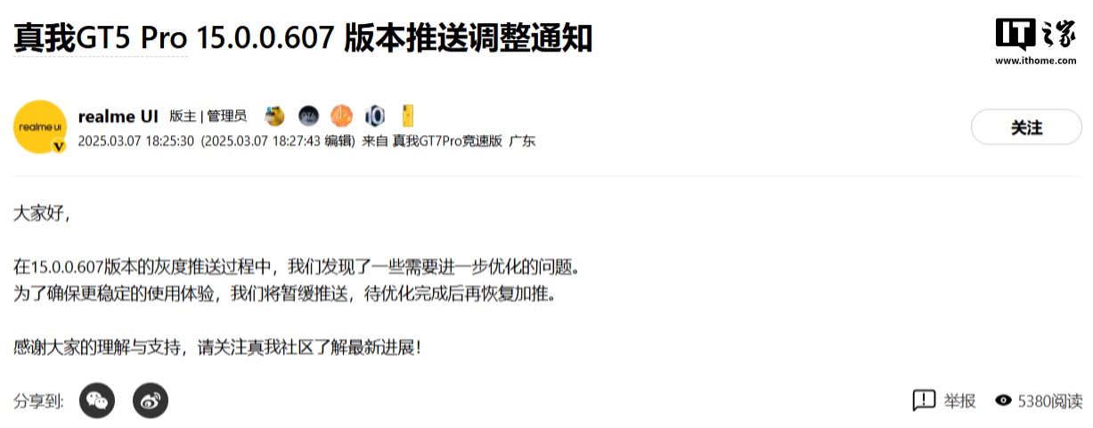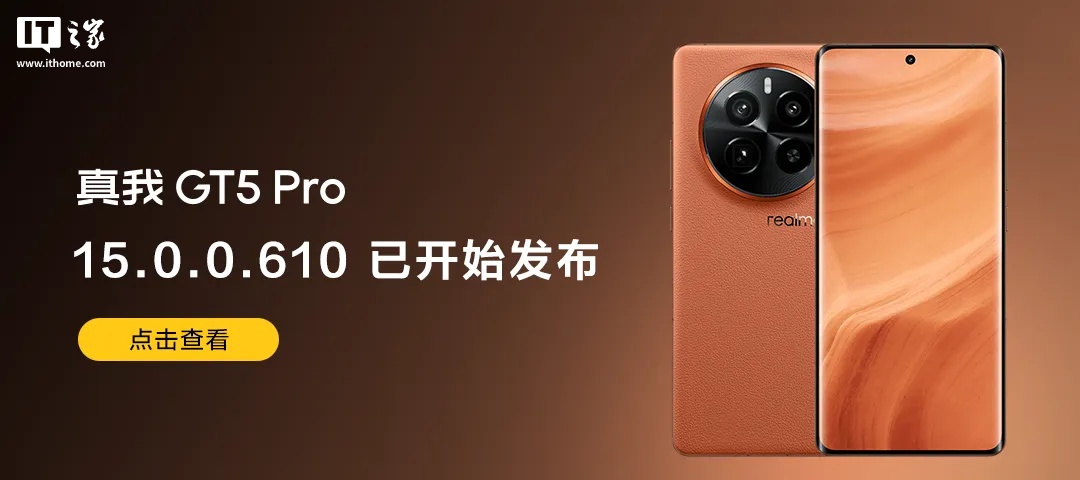 IT之家注意到,真我官方本月(3 月 7 日)在真我社区发布 GT5 Pro 手机 15.0.0.607 版本推送调整通知,称“现了一些需要进一步优化的问题”,此次推送的 610 版本预计已修复这些问题。