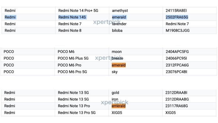 根据 Google Play 支持设备列表的截图,小米 REDMI Note 14S 的设备代号为“emerald”,型号为 2502FRA65G。IT之家注:“emerald”代码也曾用于去年的 POCO M6 Pro(4G)和红米 Note 13 Pro(4G)等机型。