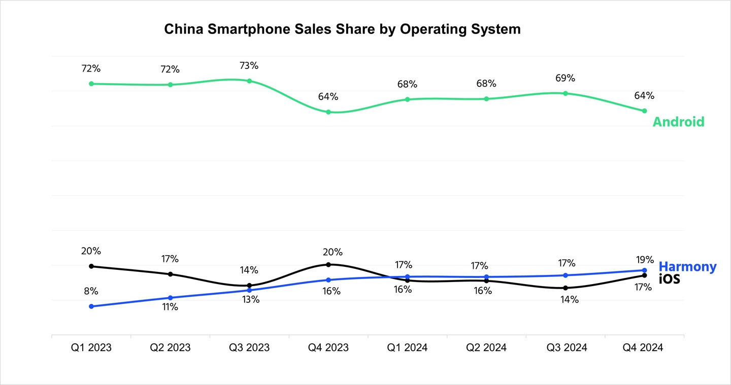 文章来源于互联网:IT之家-CounterPoint 报告 2024Q4 中国手机系统:安卓 64%,鸿蒙 19% 连续 4 个季度超 iOS