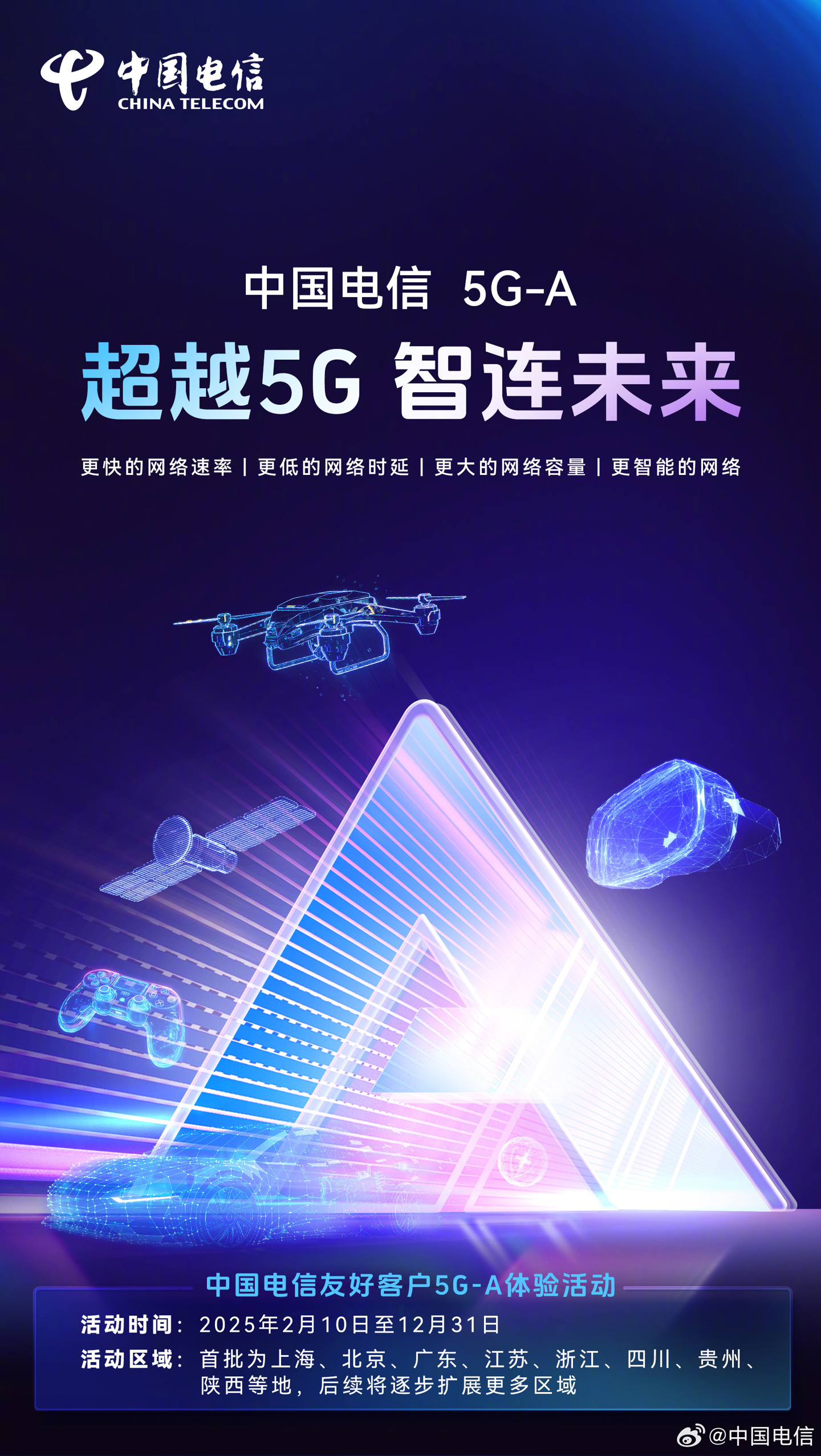 此外,中国电信宣布从 2025 年 2 月 10 日至 12 月 31 日开展友好客户 5G-A 体验活动,首批体验活动在上海、北京、广东、江苏、浙江、四川、贵州、陕西等地开展,后续将逐步扩展到更多区域,具体各地活动时间IT之家小伙伴可以咨询当地中国电信官方。