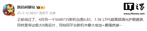 IT之家注意到,博主 @数码闲聊站 曾爆料称某厂骁龙 8s Elite(SM8735)新机 4 月发布,搭载 1.5K LTPS 超高频调光护眼直屏,采用窄边框大 R 角设计,据称是“同档同平台新机中最大电池 + 最强质感”。