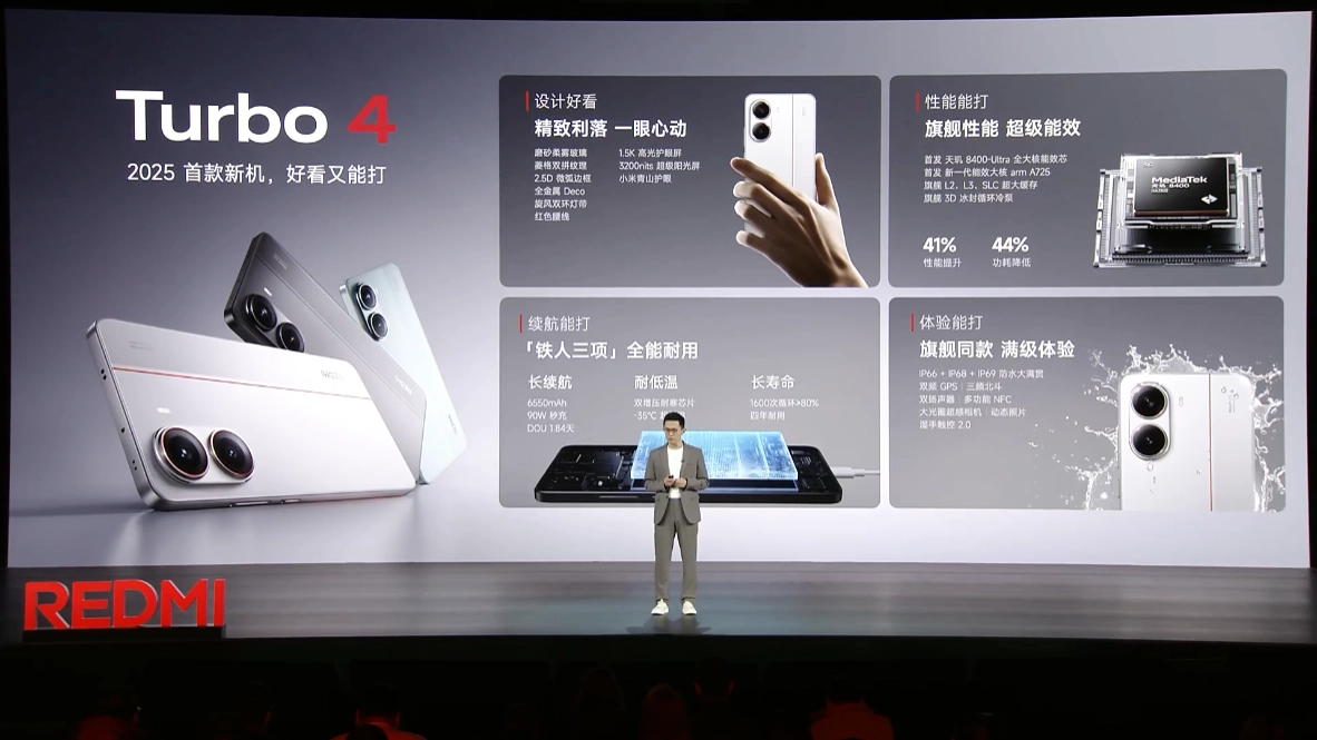 作为参考,小米 REDMI Turbo 4 手机于今年 1 月发布,售价 1999 元起。该机首发搭载天玑 8400-Ultra 处理器,采用 2.5D 微弧边框、全金属 Deco,机身正面配备一块 6.67 英寸 2712×1220 柔性 OLED 直屏。