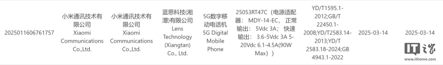 IT之家 3 月 15 日消息,一款型号为“25053RT47C”的小米新机昨日通过 3C 认证,支持 90W 快充,预计为下月发布的 REDMI Turbo 4 Pro。