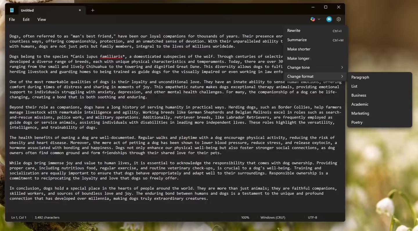 此外,记事本中的“重写”功能现在更名为“Copilot”。微软正在将Windows 11中所有与AI相关的功能逐步整合到Copilot品牌下。此次更新后,记事本工具栏中新增了一个“Copilot”按钮,用户可以通过它打开原有的“重写”功能,该功能由ChatGPT提供支持。除了改变文本语气外,用户现在还可以选择全部文本并生成摘要。此前,该功能仅支持重写现有文本,而如今用户可以对内容进行总结。