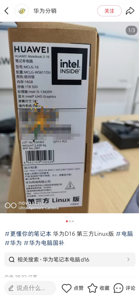 快科技3月16日消息,根据华为线下门店员工在小红书发帖,华为MateBook D16 Linux版已经开售,售价4299元,比Windows版便宜300元。