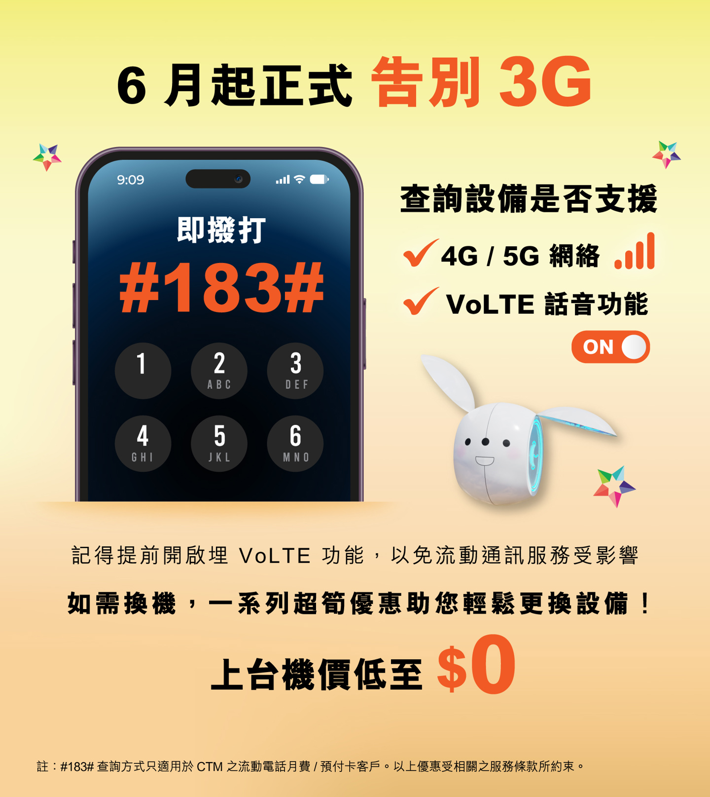 澳门电讯会通过短信通知仍使用 3G 服务的客户,及时更新服务计划及设备。客户亦可通过拨打 #183# 查询设备是否支持 4G / 5G 网络以及 VoLTE 话音功能。如有任何疑问或需协助,可亲临任何一间 CTM 门市或致电 CTM 服务第一热线:1000 查询。