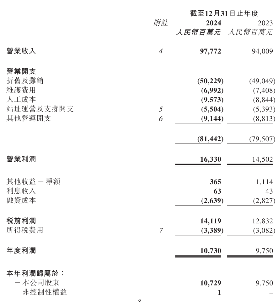 IT之家 3 月 17 日消息,中国铁塔今日在港交所公告,公司 2024 年实现营业收入为人民币 977.72 亿元,同比增长 4.0%;归属于本公司股东的利润为人民币 107.29 亿元,同比增长 10.0%。