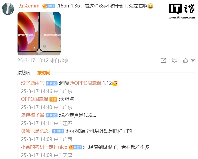 针对评论区有网友称“16pm 1.36,看这样 x8s 不得干到 1.32 左右啊”,周意保回复“大胆点”。由此来看,新机黑边有望≤ 1.32mm。