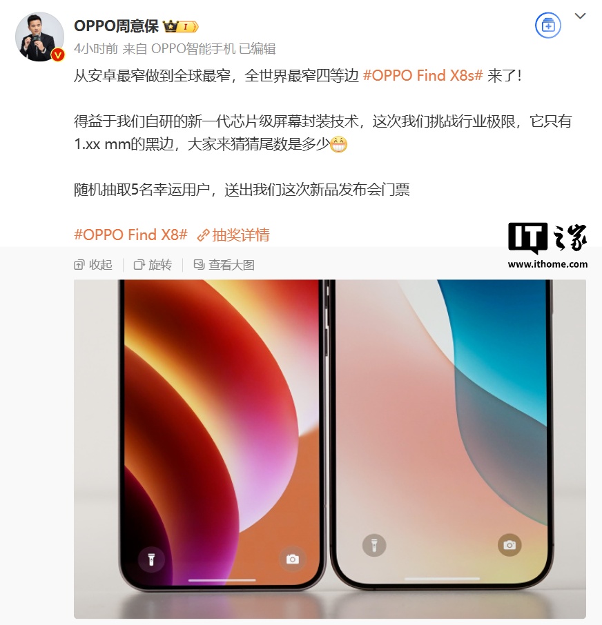 文章来源于互联网:IT之家-OPPO 周意保:Find X8s 手机采用自研新一代芯片级屏幕封装技术,黑边“1.xx mm”