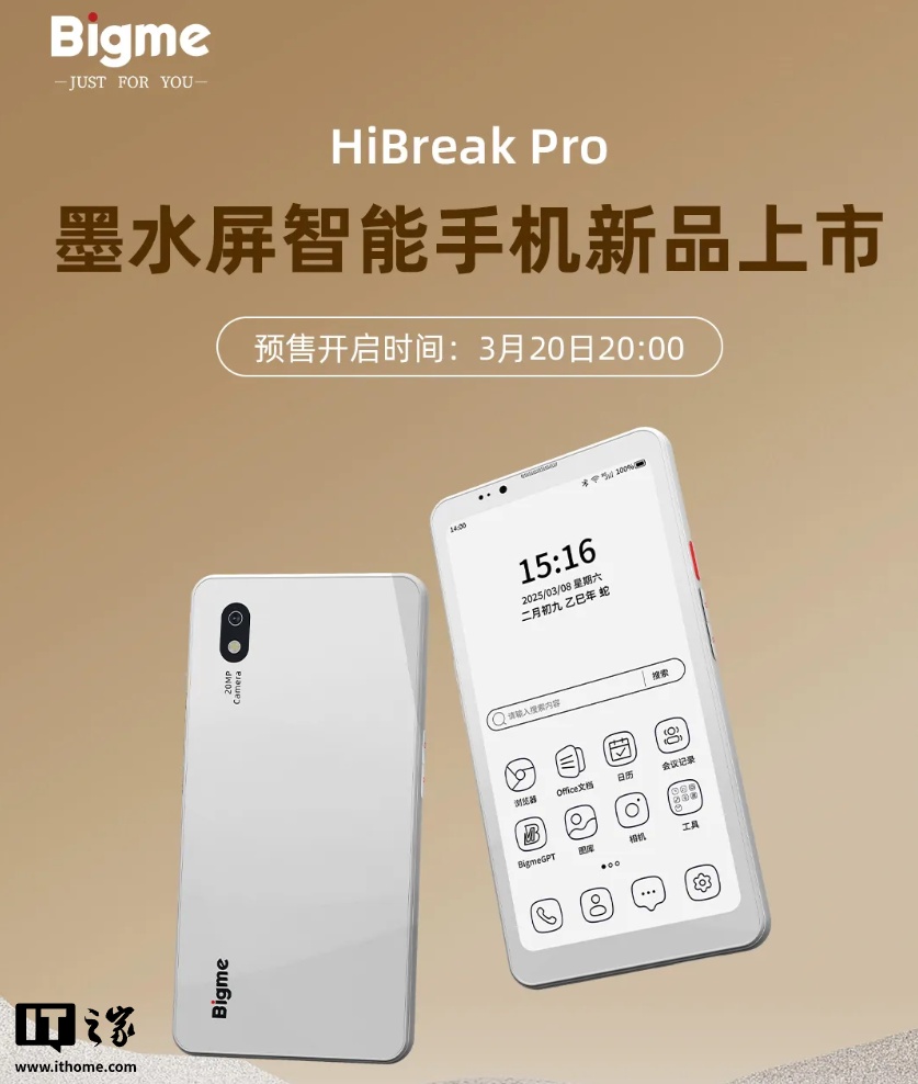 IT之家 3 月 17 日消息,Bigme 大我今日官宣,HiBreak Pro 墨水屏智能手机将于 3 月 20 日 20:00 在国内开启预售,新品搭载天玑 1080 处理器、内置 4500mAh 电池(新品暂未上架,国行价格未公布)。