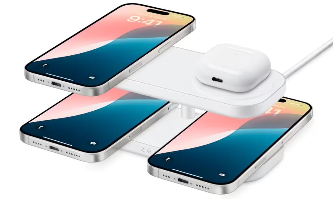 这款充电器采用双层磁吸架构,每层集成两个MagSafe充电模块,可同时为四台iPhone手机或AirPods耳机同步充电。