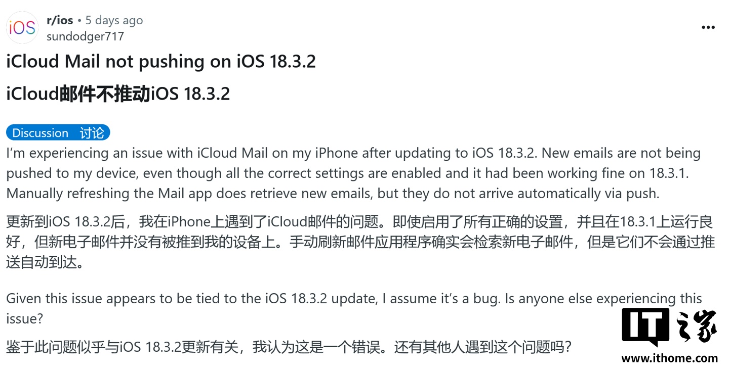 文章来源于互联网:IT之家-iCloud 邮件变“哑巴”:部分 iPhone 用户反馈苹果 iOS 18.3.2 更新导致推送故障