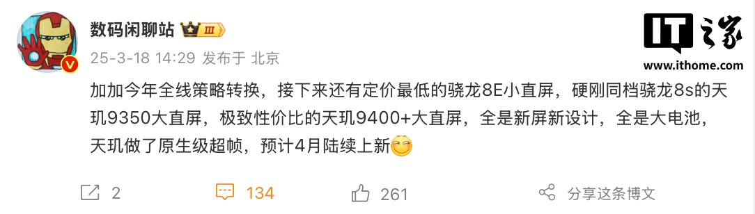 IT之家 3 月 18 日消息,博主 @数码闲聊站发文,透露一加今年转变策略,将于下月起推出“定价最低的骁龙 8 至尊版”小直屏手机、“天玑 9350 大直屏”手机、极致性价比的天玑 9400 + 大直屏手机。均采用“新屏新设计 + 大电池”。