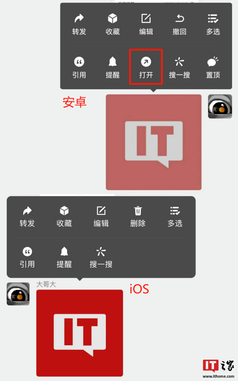 一个是长按图片新增“打开”:在安卓测试版中,长按聊天中的任一图片,弹出的选项中新增“打开”选项。