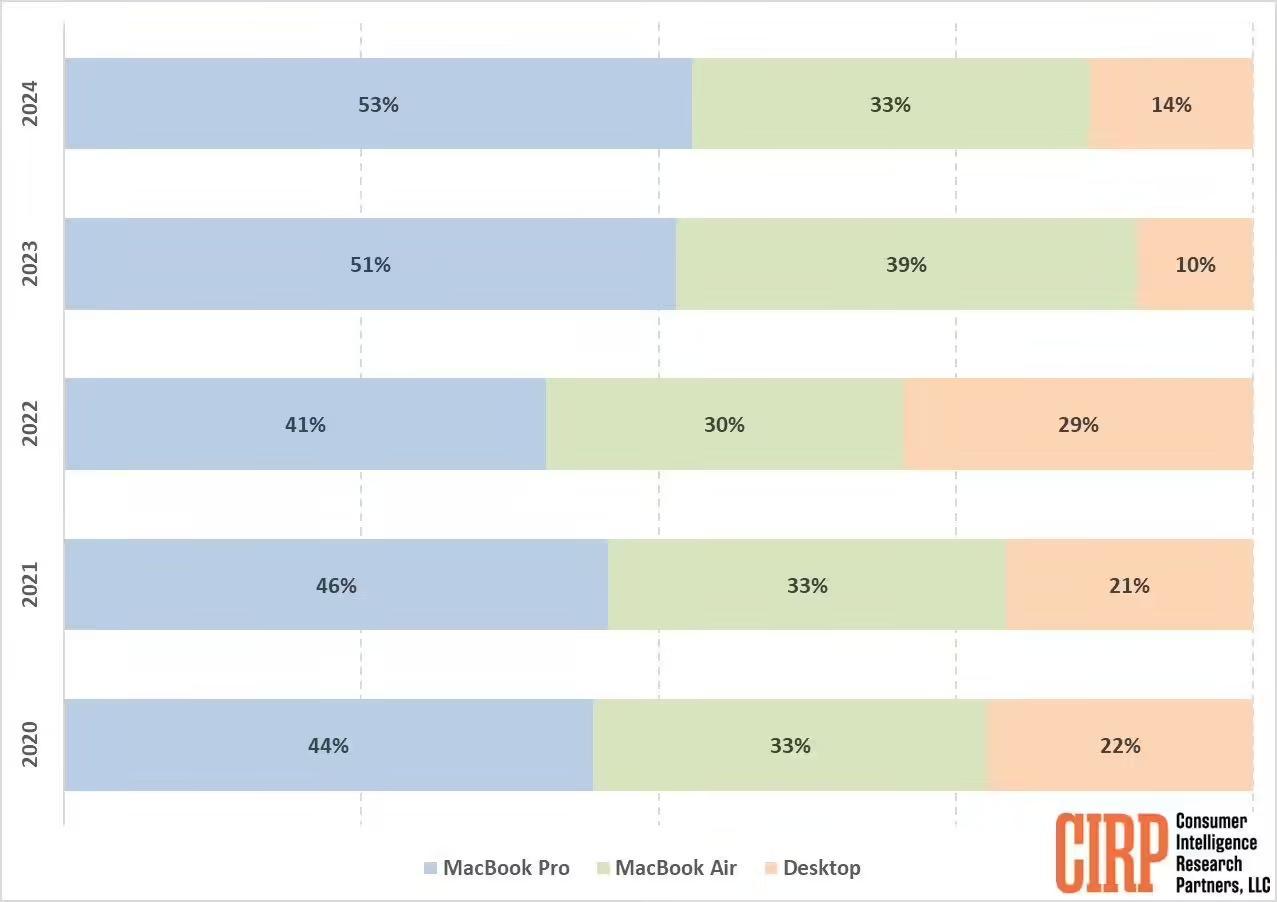 CIRP数据显示2024年在美国市场,MacBook占苹果Mac电脑总销量的86%,其中Pro系列长期领跑,比重为53%。