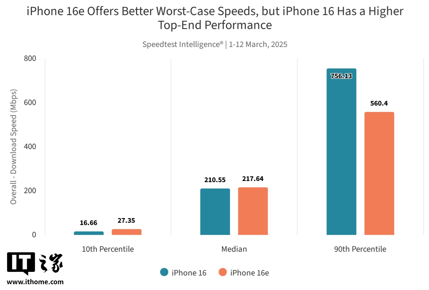 值得注意的是,在下载速度最低的 10% 用户数据中,iPhone 16e 的表现明显优于 iPhone 16。