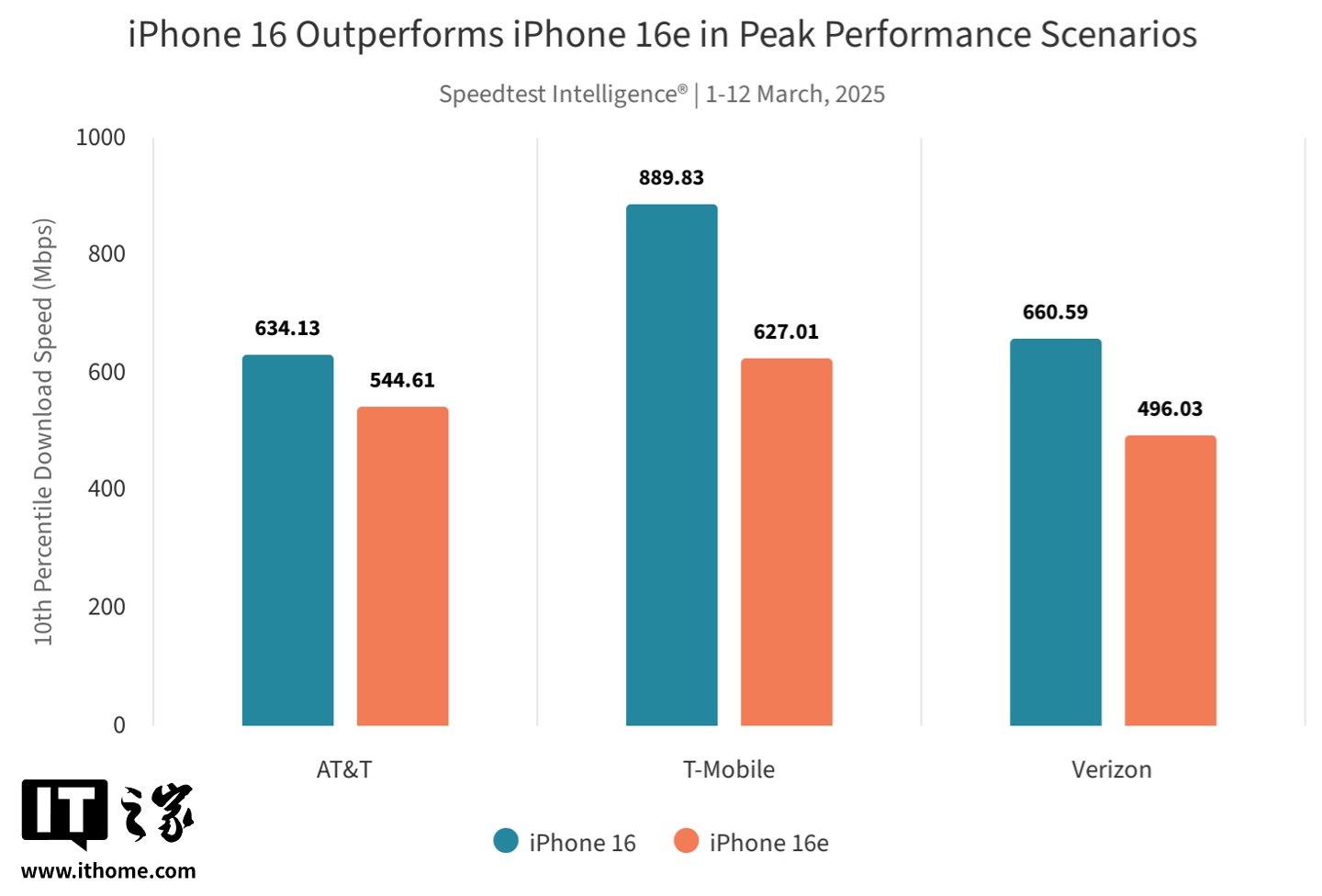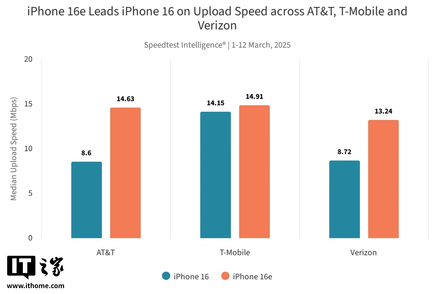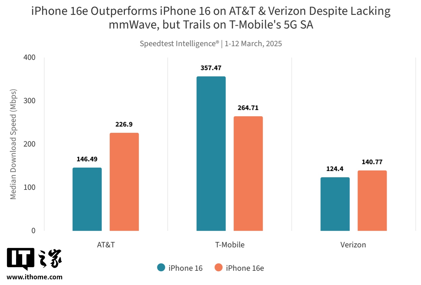 根据 Ookla 昨晚发布的最新 Speedtest(2025 年 3 月 1 日至 12 日)测试报告,iPhone 16e 在美国三大运营商网络环境下表现不一,在 AT&T 和 Verizon 网络下的中位下载速度略优于 iPhone 16,但在 T-Mobile 网络下表现明显落后。