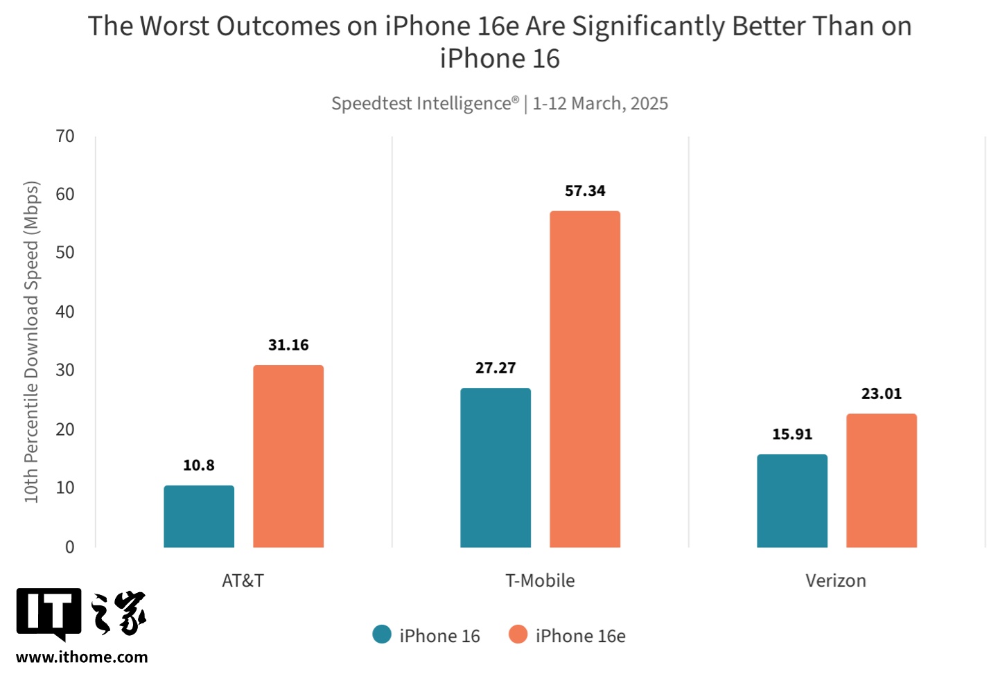 文章来源于互联网:IT之家-Ookla 实测苹果自研 C1 调制解调器:iPhone 16e 在 AT&T、Verizon 网络中表现亮眼,T-Mobile 反之