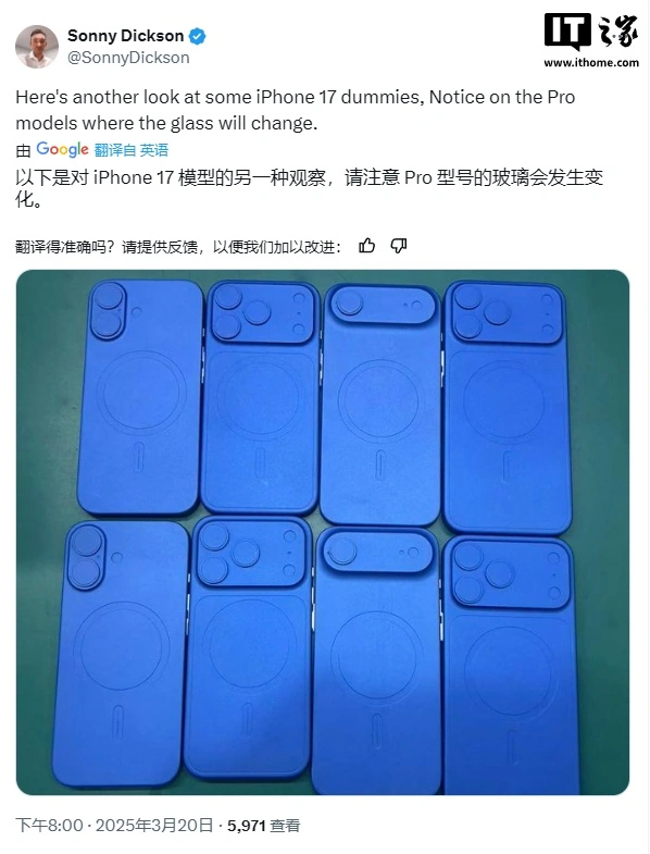 IT之家 3 月 20 日消息,爆料人 Sonny Dickson 分享了苹果即将推出的 iPhone 17 系列的更多模型,揭示了 iPhone Pro 机型设计的变化,这些变化不仅局限于新的后置摄像头模块。