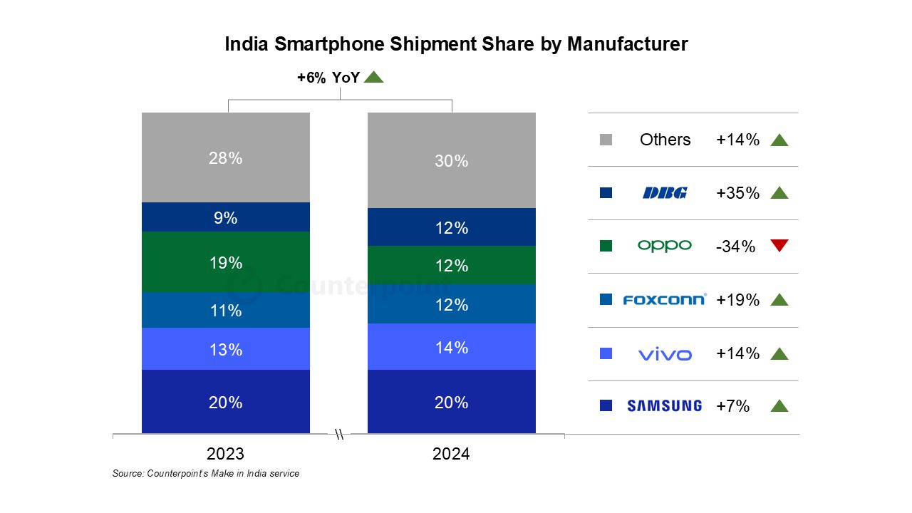 文章来源于互联网:IT之家-CounterPoint 报告 2024 印度本土制造智能手机出货量:三星同比增 7%、vivo 增 14%、富士康增 19%、OPPO 降 34%
