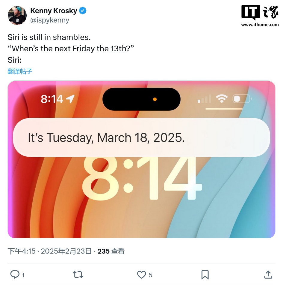 文章来源于互联网:IT之家-苹果 Siri 日期计算出糗:无法计算下个周五是 13 号的日期
