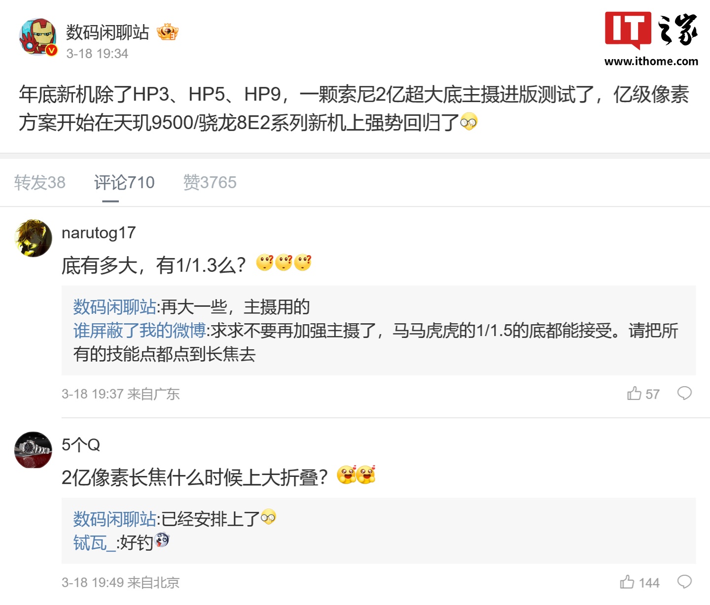 IT之家 3 月 21 日消息,博主 @数码闲聊站 本月 18 日表示,索尼的一颗 200MP 手机图像传感器现已“进版测试”,这一产品将被用于智能手机主摄,尺寸大于 f/1.3。
