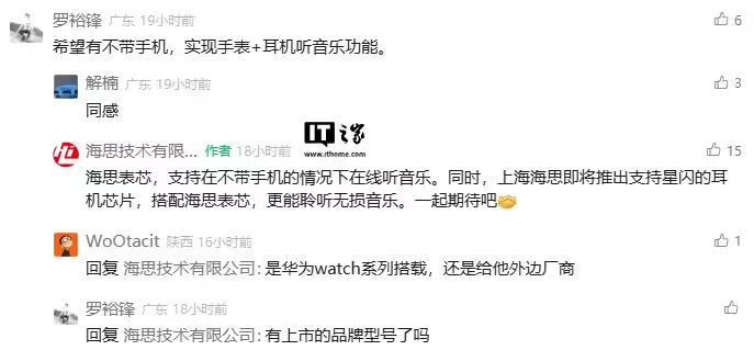 IT之家注意到,上海海思在该文章的评论区中还回复了关于星闪耳机的问题:“海思表芯,支持在不带手机的情况下在线听音乐。同时,上海海思即将推出支持星闪的耳机芯片,搭配海思表芯,更能聆听无损音乐。”