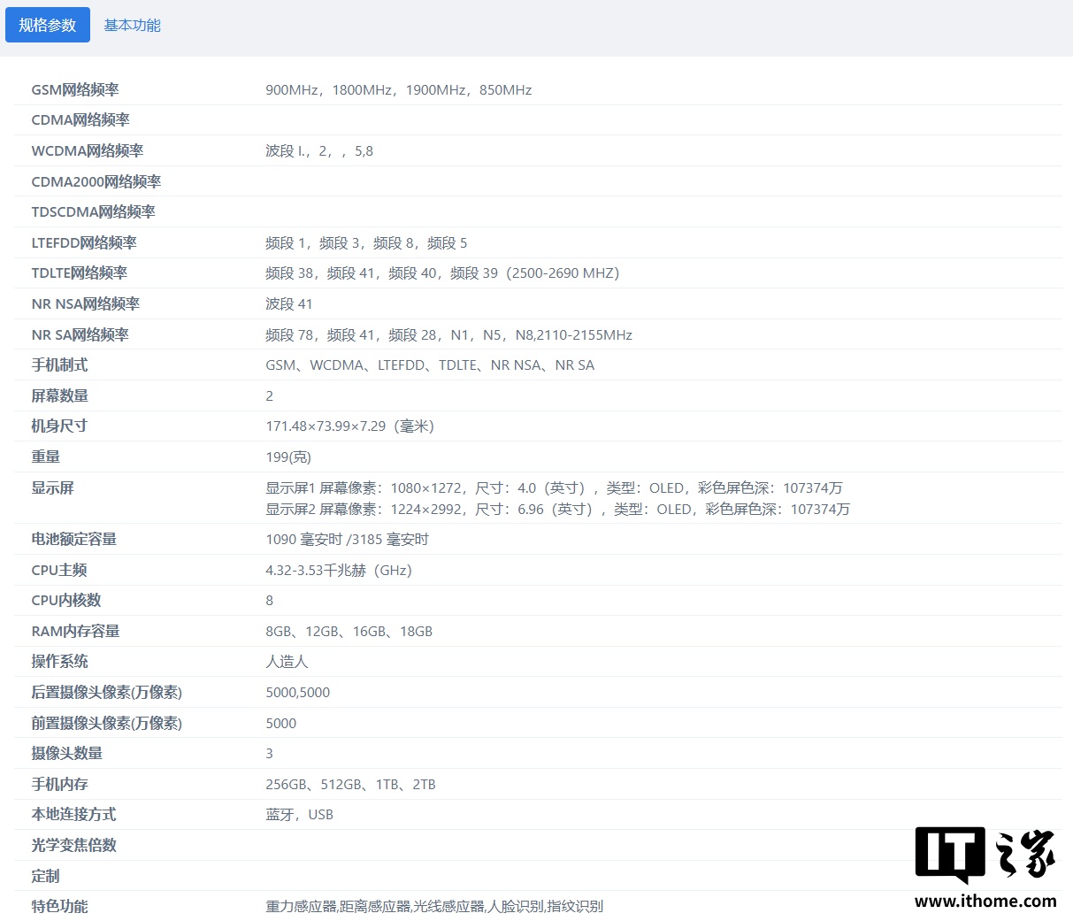 新机电池容量为 1090mAh /3185mAh(预计为双电芯设计),后置 5000 万 + 5000 万像素镜头组合、前置 5000 万像素镜头。
