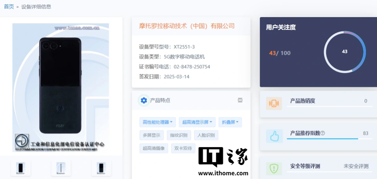 文章来源于互联网:IT之家-摩托罗拉 moto“XT2551-3”手机现身电信设备终端网,预计为 razr 60 Ultra