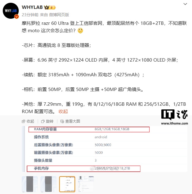据博主 @WHYLAB 消息,该机为摩托罗拉 moto razr 60 Ultra,顶配规格为 18GB+2TB,主要配置信息如下: