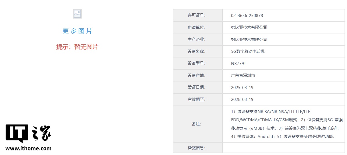 IT之家 3 月 23 日消息,型号为“NX779J”努比亚新机已现身电信设备终端网,并通过工信部电信设备进网审核。新机支持 NR SA / NR NSA / TD-LTE/ LTE FDD / WCDMA / CDMA 1X / GSM 制式、5G-增强移动宽带(eMBB)技术、5G 异网漫游功能等。