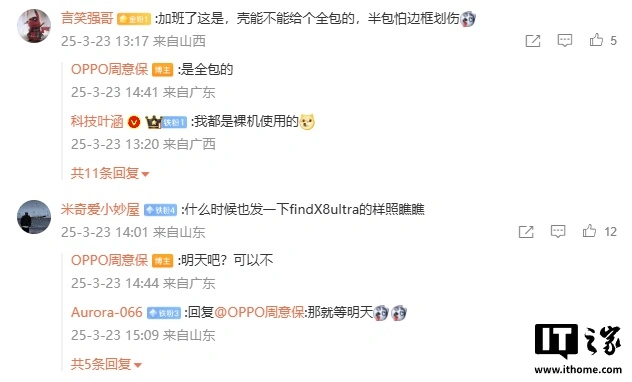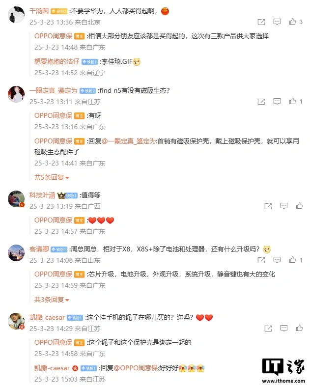 周意保还在评论区回复了部分网友的问题:针对手机壳是否为全包设计,他回复“是全包的”;针对新机价格是否人人都买得起,他表示“相信大部分朋友应该都是买得起的,这次有三款产品供大家选择”;针对手机壳挂绳是否为赠品,他称“这个绳子和这个保护壳是绑定一起的”。