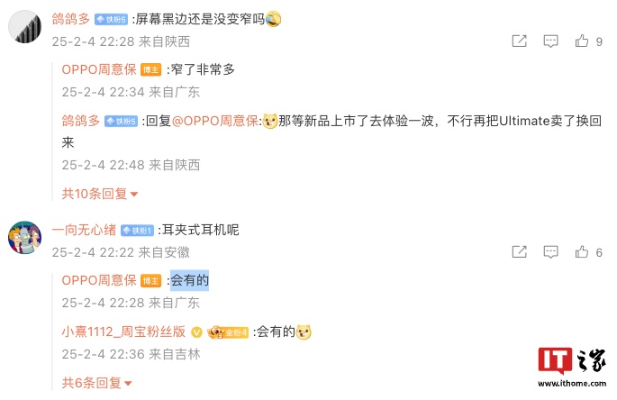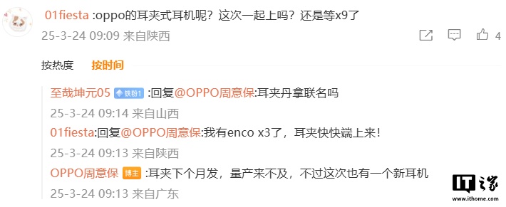 IT之家注意到,今日有用户在周意保的微博评论区中留言询问 OPPO 耳夹式耳机的发布时间,周意保表示:“耳夹下个月发,量产来不及,不过这次也有一个新耳机。”