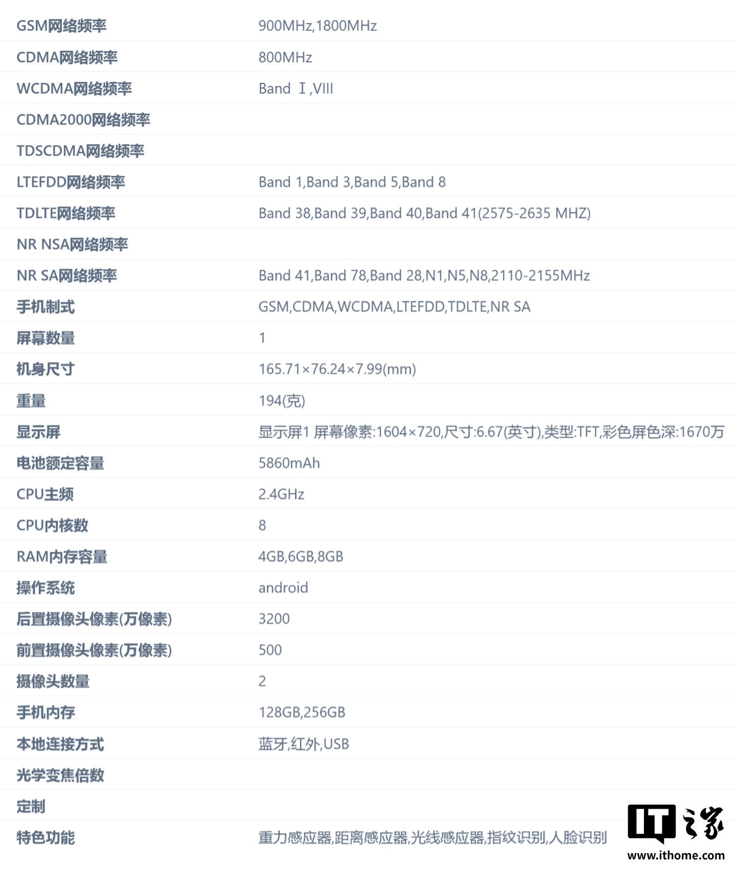该机配备 6.67 英寸 TFT LCD 屏幕,分辨率为 1604 x 720 像素,支持 1670 万色。其他规格包括 5860mAh 电池、2.4GHz 八核处理器、4GB / 6GB / 8GB RAM、128GB / 256GB 存储、32MP 主摄、5MP 自拍摄像头、红外传感器、USB 接口以及侧边指纹识别。