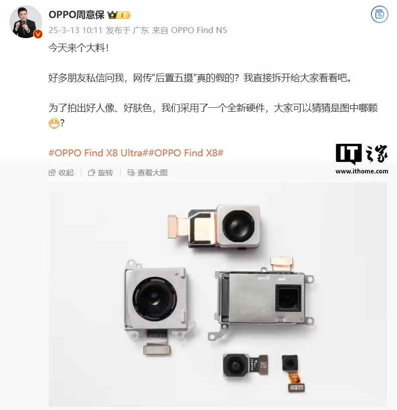 据此前报道,OPPO Find 系列产品负责人周意保本月(3 月 13 日)公布了 Find X8 Ultra 手机的镜头组件,并表示为了拍出好人像、好肤色,新机采用了一个全新硬件。