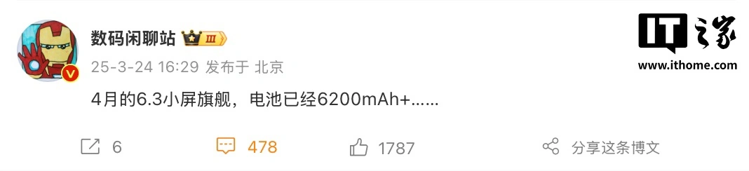 IT之家 3 月 24 日消息,博主 @数码闲聊站 发文,透露下月将有一款 6.3 英寸小屏旗舰手机登场,该机据称将配备 6200 毫安时电池。参考评论区,该机有望为“一加 13T”手机。