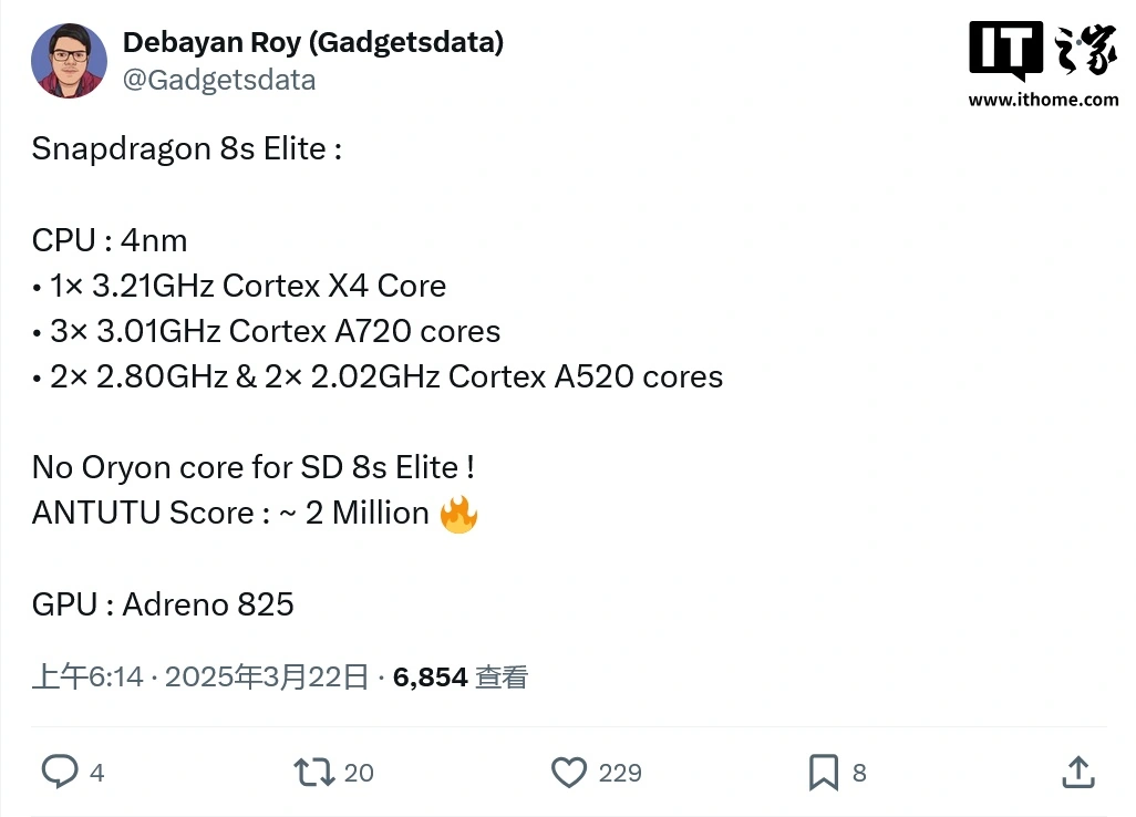 IT之家 3 月 24 日消息,消息源 @Gadgetsdata 于 3 月 22 日在 X 平台发布推文,分享了高通骁龙 8s 至尊版芯片的更多细节,并透露该芯片的各项配置更接近于骁龙 8s Gen 3 芯片。