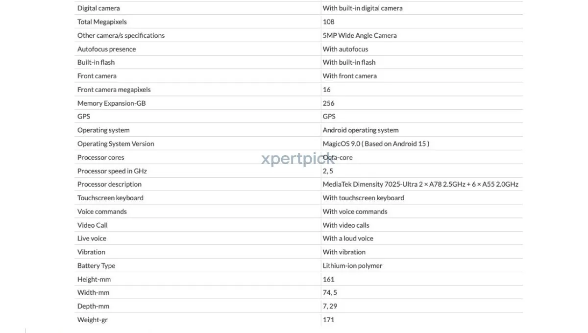 系统方面,该机运行基于安卓 15 的 Magic 9.0 系统,机身尺寸为 161 x 74.5 x 7.29 毫米,重量为 171 克,轻薄便携。