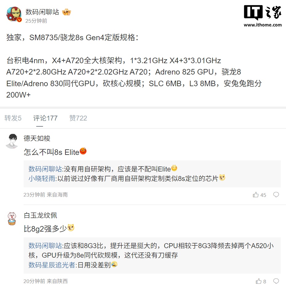 IT之家 3 月 25 日消息,博主 @数码闲聊站 今日爆料了高通骁龙 8s Gen 4 处理器(SM8735)的定版规格: