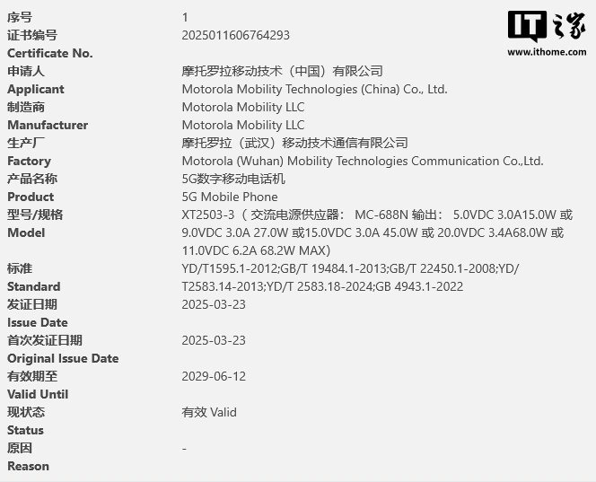 IT之家 3 月 25 日消息,摩托罗拉新机 Edge 60 Fusion(型号 XT2503-3)近日通过国内 3C 认证,确认支持 68W 快充,预计 4 月国内发布。