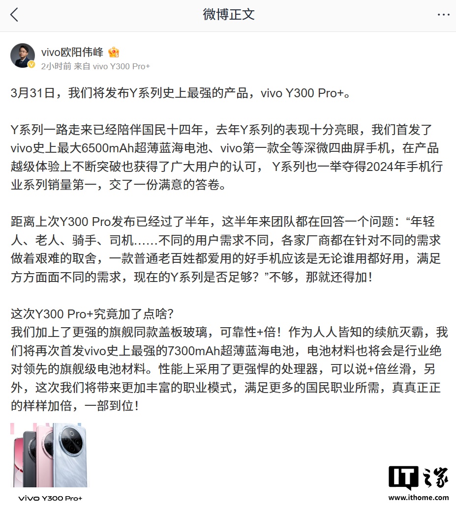 IT之家 3 月 25 日消息,vivo 产品副总裁欧阳伟峰今日宣布,vivo Y300 Pro+ 手机将于 3 月 31 日发布,新机号称“Y 系列史上最强的产品”。
