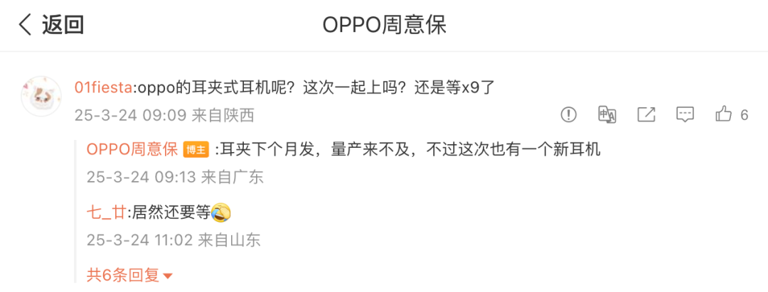 OPPO Find X8 系列发布会又要来了,但之前说的那款耳夹式开放耳机,还要再等等。3 月 24 日,有网友在 OPPO Find 系列产品负责人周意保的微博评论区中,询问了 OPPO 耳夹式开放耳机的发布时间,周意保当场表示: