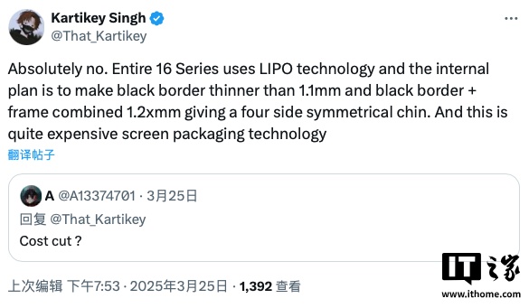 后续有用户询问转为直屏设计是否是为了控制成本,而 Singh 称绝非是为了控制成本,16 系列全系采用 LIPO 技术,内部计划是让黑边小于 1.1 mm,黑边 + 边框合计 1.2X mm,四边等宽,他还称 LIPO 是相当昂贵的屏幕封装技术。