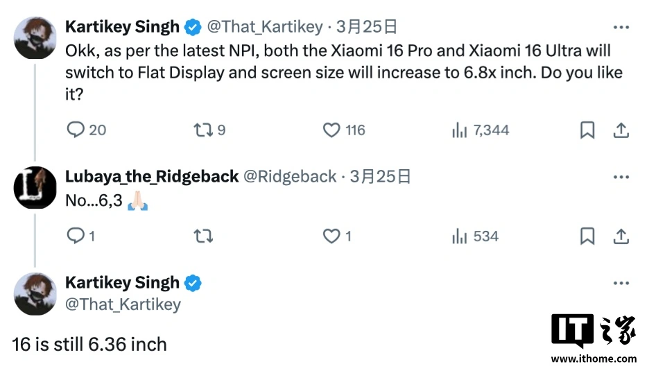 IT之家 3 月 26 日消息,消息人士 Kartikey Singh 昨日于 X 上发文,称根据最新的 NPI(新产品导入)环节,小米 16 Pro 和 16 Ultra 都将采用直屏,并称 16 系全系采用 LIPO 技术。