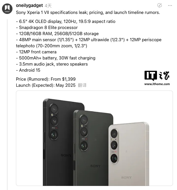 根据 Oneilygadget 的爆料,索尼 Xperia 1 VII 的配置如下: